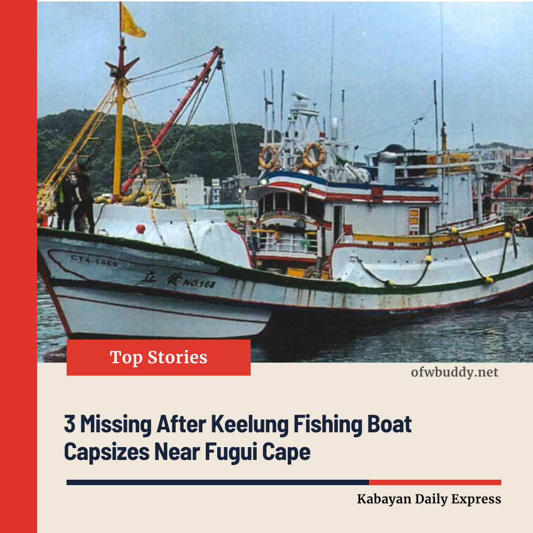 A fishing vessel registered in Badouzi, Keelung, identified as Li Fa 168, capsized this afternoon about 24 nautical miles north of Fugui Cape, leaving three fishermen missing. Out of the six crew members on board, three were successfully rescued by a nearby vessel, Li Fa 368, while search and rescue operations continue for the remaining crew.