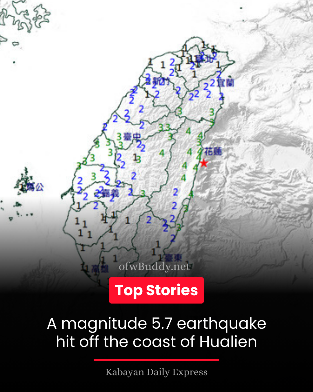 A magnitude 5.7 earthquake struck off the coast of Hualien County at 7:24 p.m. on Monday evening, sending noticeable tremors across many parts of Taiwan. The strongest shaking, measuring Intensity 4, was reported in Yenliao, Hualien City, and Aowanda in Nantou County.