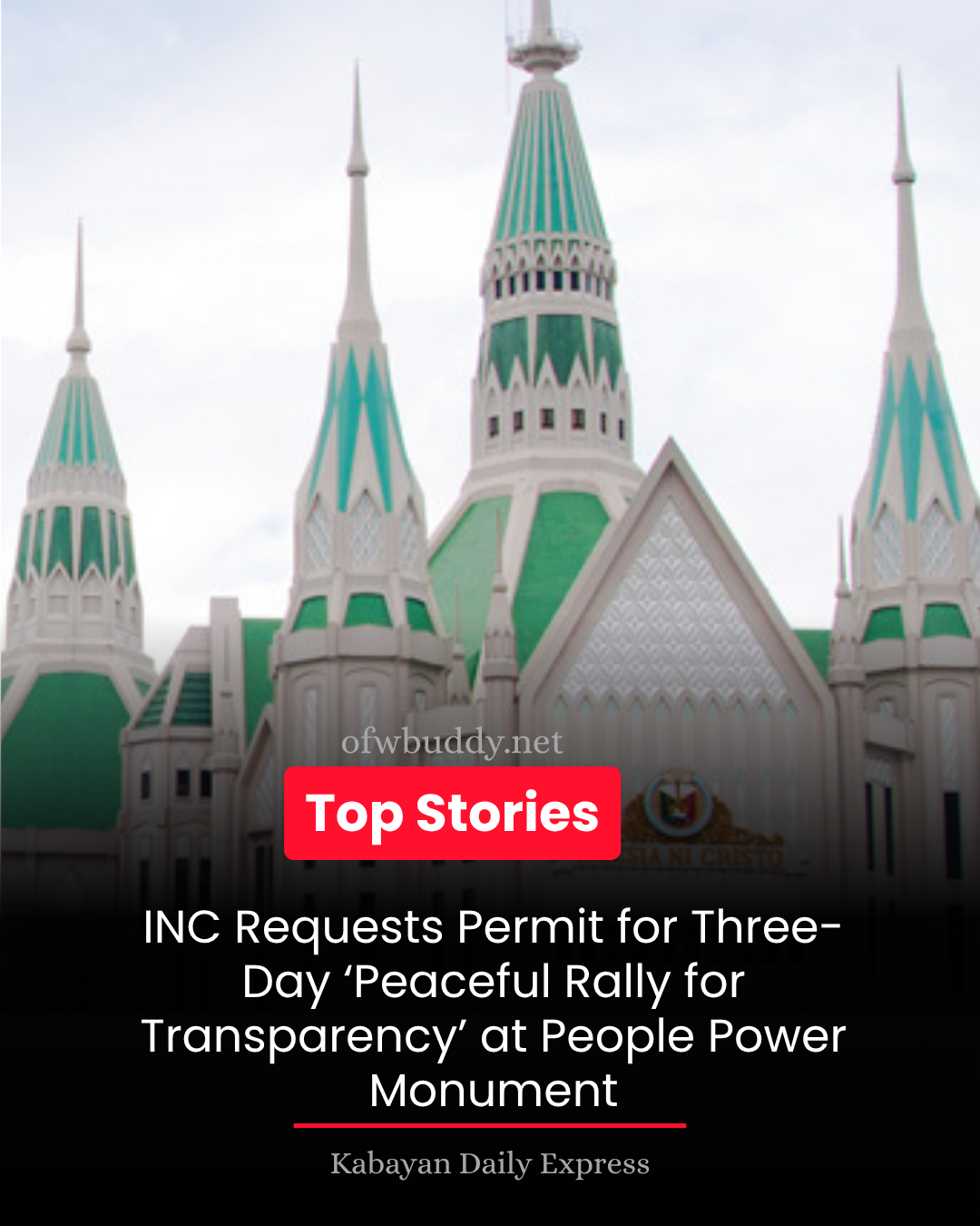 The Iglesia Ni Cristo (INC) has formally asked the Quezon City government for permission to conduct a large-scale public assembly titled “Peaceful Rally for Transparency” at the People Power Monument…