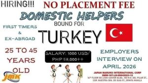 A licensed recruitment agency has announced urgent hiring for domestic helpers bound for Turkey, offering a no-placement-fee opportunity for qualified Filipino applicants seeking employment abroad.