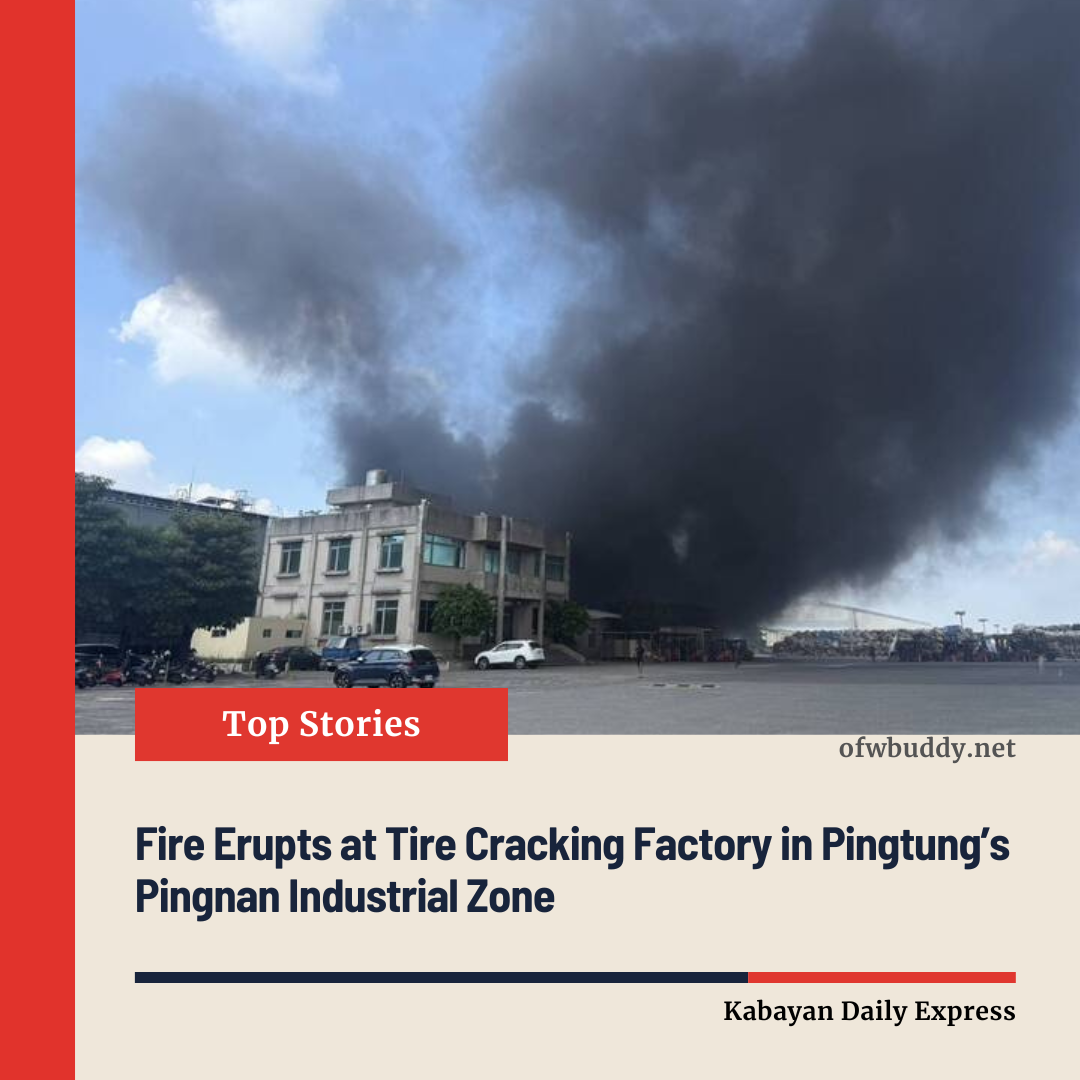 A fire broke out this morning at a tire cracking factory in the Pingnan Industrial Zone, Pingtung, sending thick black smoke billowing into the sky and releasing a strong foul odor that alarmed nearby residents and passersby.