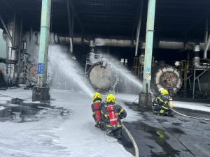 According to the Pingtung County Fire Department, the blaze started around 10:00 a.m., originating from a rubber cracking furnace inside the factory. Upon receiving the emergency call, firefighters swiftly mobilized units from Fangliao, Jiadong, Linbian, and Donggang, along with the Special Search Team and the Third Brigade, totaling 13 vehicles, 21 personnel, and one firefighting robot. The response was led by Third Brigade Captain Wu Mingdi.