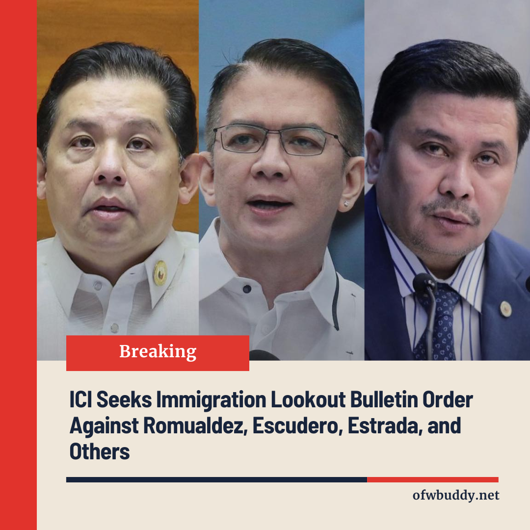 MANILA, Philippines — October 8, 2025 — The Independent Commission for Infrastructure (ICI) has formally requested the Department of Justice (DOJ) to issue an Immigration Lookout Bulletin Order (ILBO) against several high-profile personalities, including former House Speaker Martin Romualdez, Senator Chiz Escudero, and Senator Jinggoy Estrada, in connection with alleged irregularities in government flood control projects.