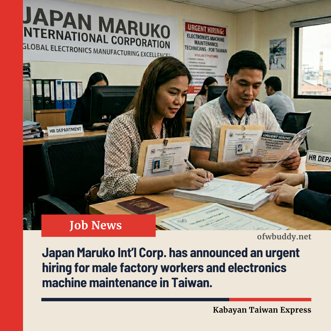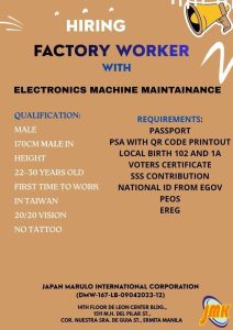 This position provides a unique opportunity to work in Taiwan’s growing electronics manufacturing sector, gain professional experience in electronics machine maintenance, and build a long-term career with a reputable company. Japan Marulo International Corporation remains committed to deploying Filipino workers safely and legally abroad.