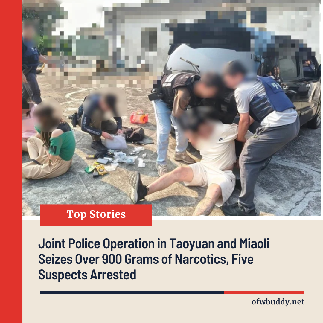 In a coordinated anti-drug operation, the Zhongli Police Precinct in Taoyuan City and the Tongxiao Police Precinct in Miaoli County successfully arrested five suspects, including a 46-year-old man surnamed Wang and a 47-year-old man surnamed Zhang, in the mountainous region of Wunan Village, Tongxiao Township, Miaoli County. Authorities confiscated more than 930 grams of illegal narcotics, including heroin, amphetamines, and etomidate.