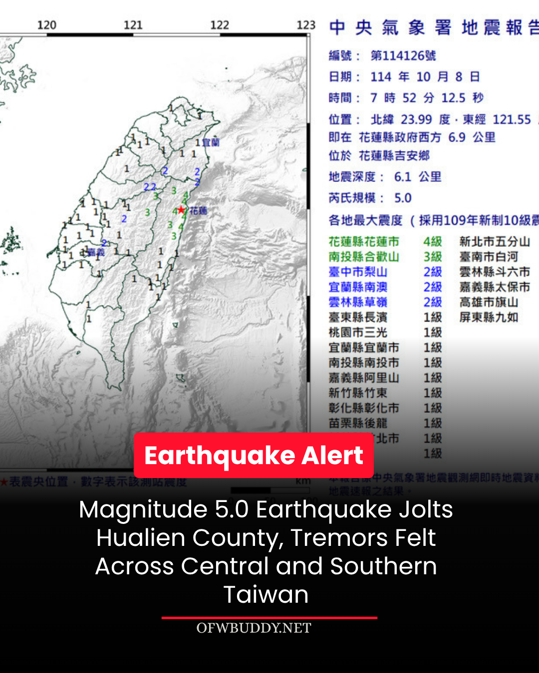HUALIEN COUNTY, Taiwan — A magnitude 5.0 earthquake struck Ji’an Township, Hualien County, at 7:52 a.m. on Tuesday, October 8, according to the Central Weather Administration (CWA).