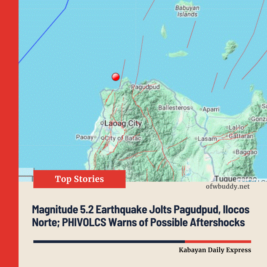 A magnitude 5.2 earthquake struck Pagudpud, Ilocos Norte, on Friday afternoon, October 17, according to the Philippine Institute of Volcanology and Seismology (PHIVOLCS).