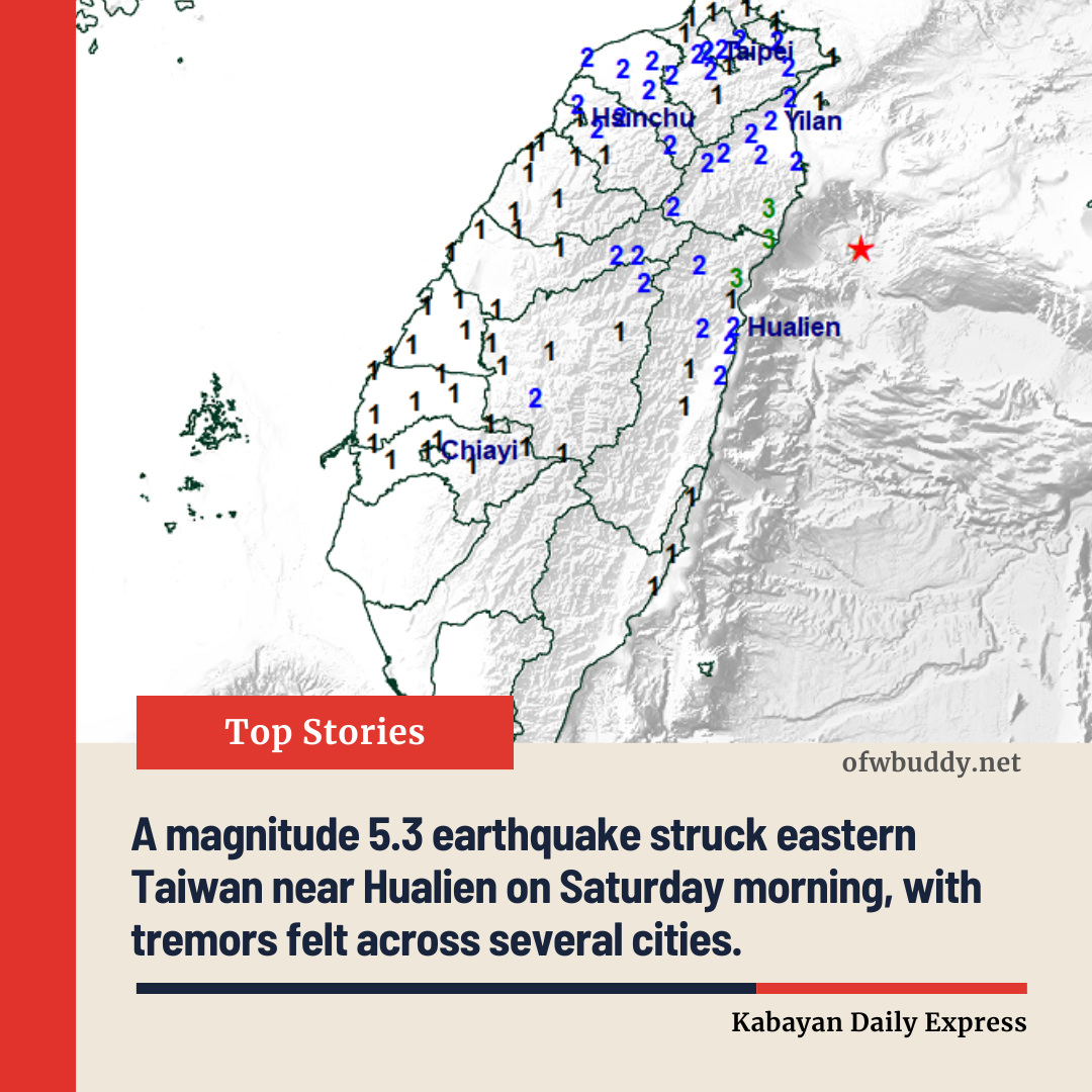 TAIWAN (October 18, 2025)— A magnitude 5.3 earthquake struck eastern Taiwan at around 10:04 a.m. on Saturday, according to data from the Central Weather Administration (CWA).