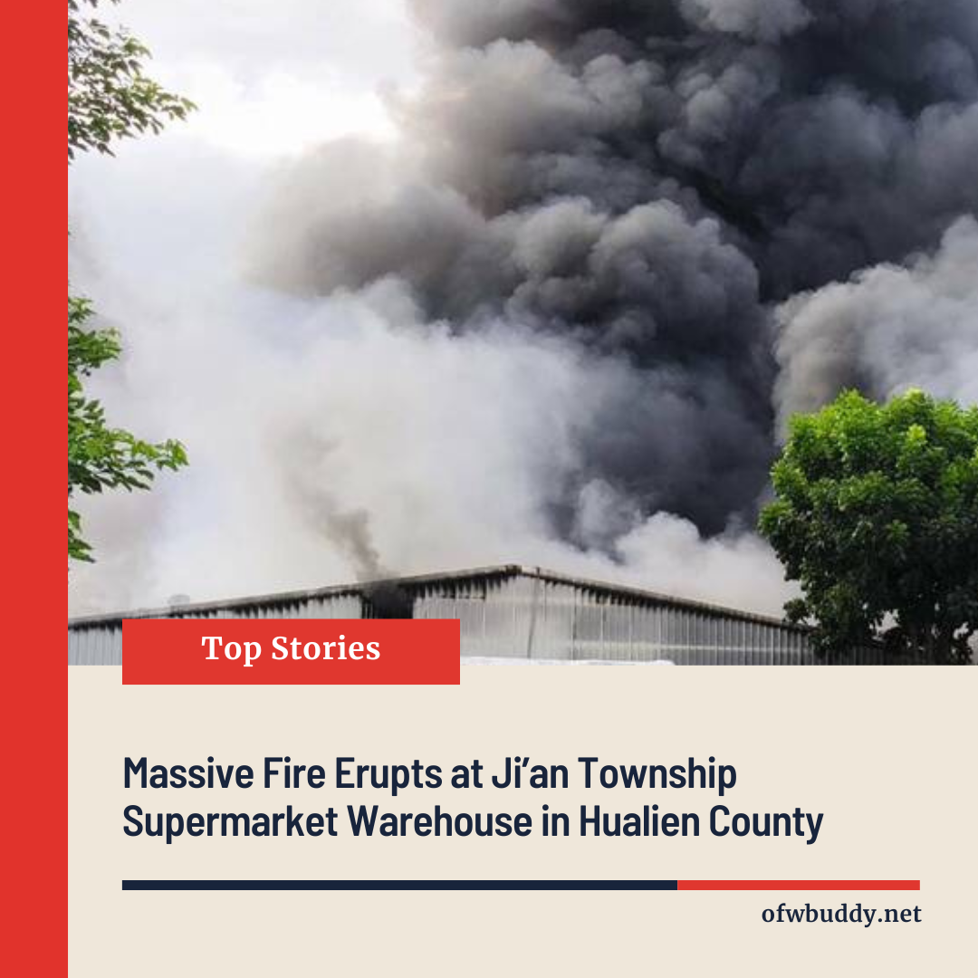 A large fire broke out this afternoon at the rear warehouse of the well-known 199 Supermarket located opposite the Dusk Market in Ji’an Township, Hualien County. Thick black smoke and roaring flames filled the air as the blaze quickly spread, prompting an extensive firefighting operation.