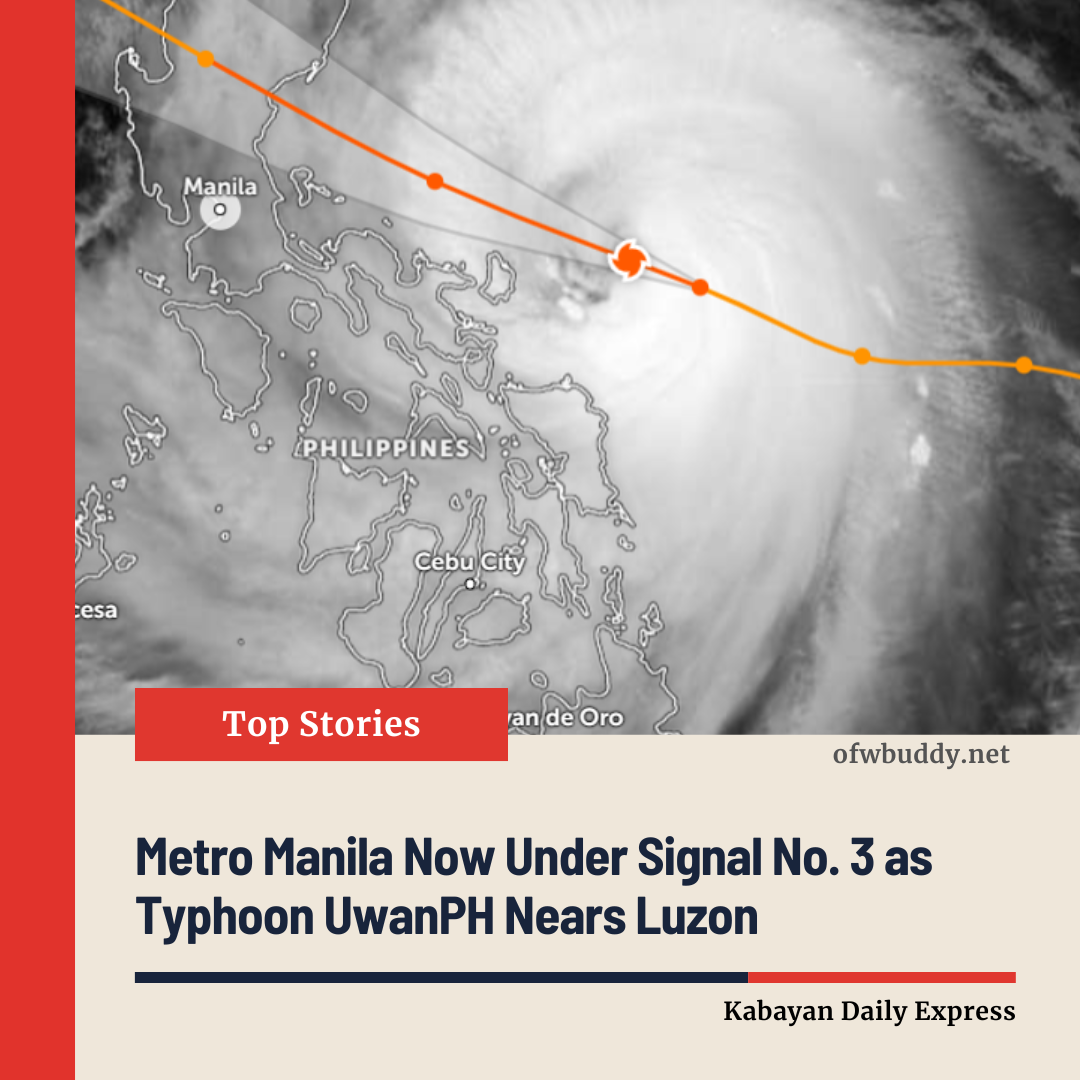 The Philippine Atmospheric, Geophysical and Astronomical Services Administration (PAGASA) has placed Metro Manila under Tropical Cyclone Wind Signal (TCWS) No. 3 as Typhoon UwanPH (Fung-Wong) continues to intensify while moving closer to Luzon early Sunday morning.