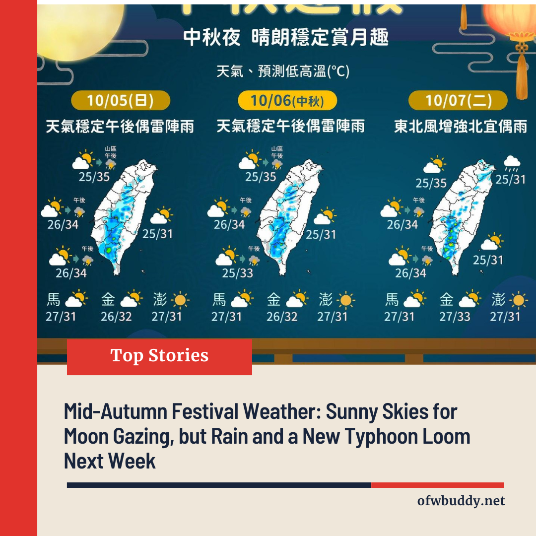 As Taiwan prepares to celebrate the Mid-Autumn Festival with a three-day weekend from October 4 to 6, the Central Weather Administration (CWA) forecasts generally sunny and hot conditions across the island — ideal for family gatherings, barbecues, and moon viewing. However, residents should brace for a shift in weather patterns once the holiday ends.