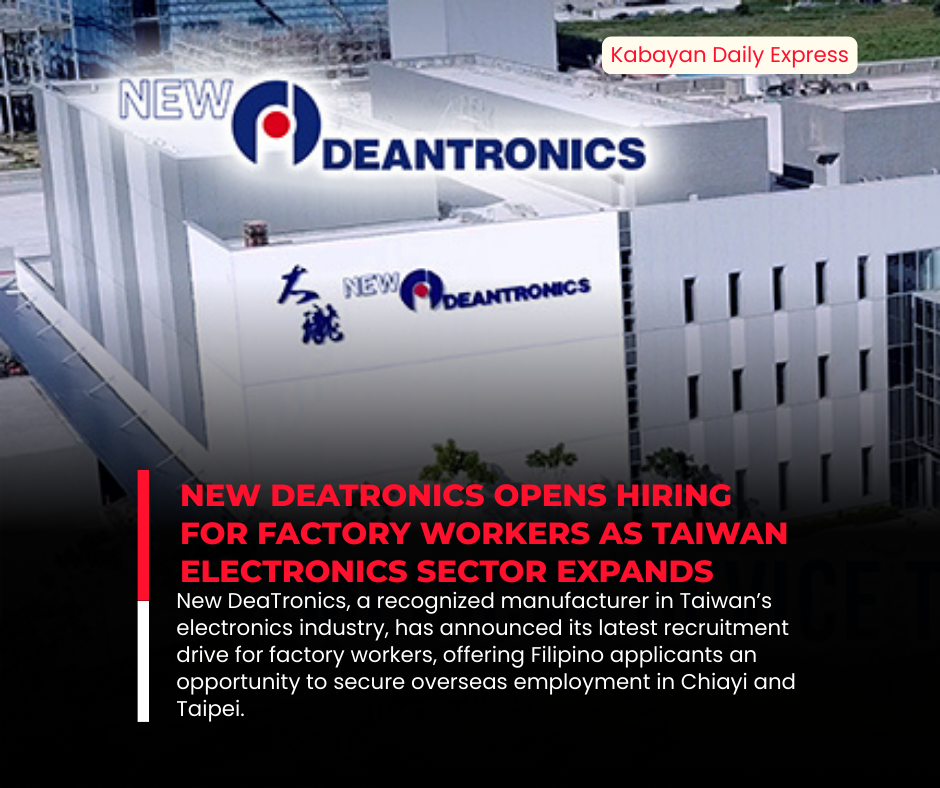 Manila, Philippines — New DeaTronics, a recognized manufacturer in Taiwan’s electronics industry, has announced its latest recruitment drive for factory workers, offering Filipino applicants an opportunity to secure overseas employment in Chiayi and Taipei.