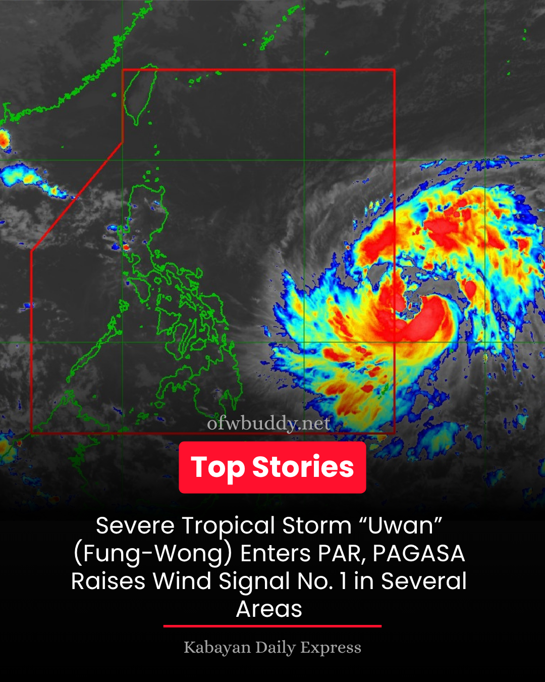 The Philippine Atmospheric, Geophysical and Astronomical Services Administration (PAGASA) announced that Severe Tropical Storm Fung-Wong has entered the Philippine Area of Responsibility (PAR) and was given the local name “Uwan.” The weather bureau has hoisted Tropical Cyclone Wind Signal (TCWS) No. 1 over several provinces in Luzon, Visayas, and Mindanao.