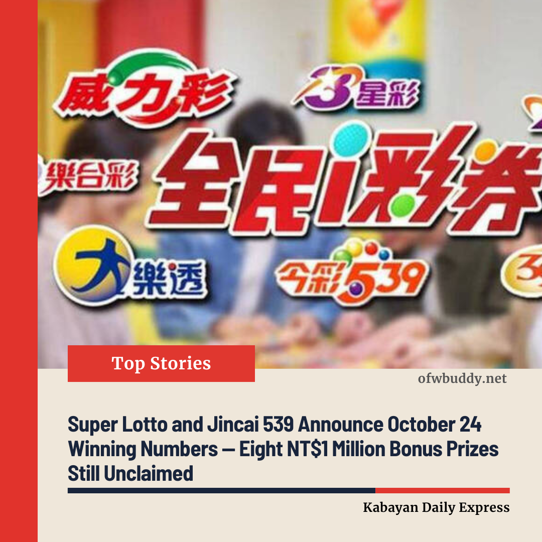 The Taiwan Lottery released the winning results for the Super Lotto (Draw No. 114000099) and Jincai 539 (Draw No. 114000258) held yesterday, October 24, 2025. While no players claimed the top jackpot prize, thousands of participants took home smaller rewards — and eight NT$1 million Mid-Autumn Festival bonus prizes remain unclaimed.