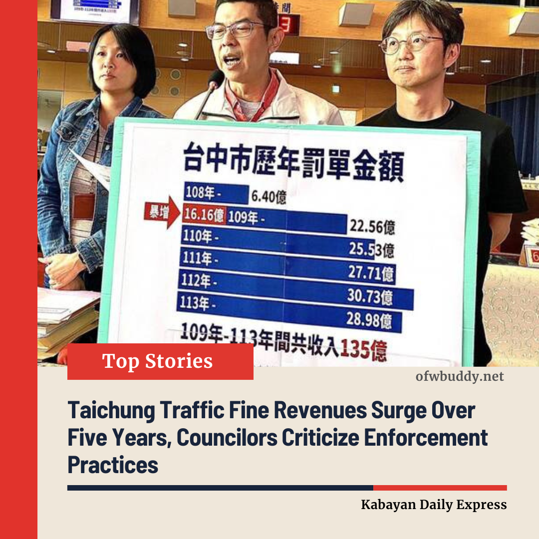 Traffic fine revenues in Taichung City have continued to climb annually since 2020, a trend that sparked sharp criticism during a general interpellation session at the Taichung City Council today. Councilors Chou Yung-hung, Chiang Chao-kuo, and Chang Chia-an revealed that over the past five years—up to the end of 2024—the city has collected a total of NT$13.5 billion in traffic fines.