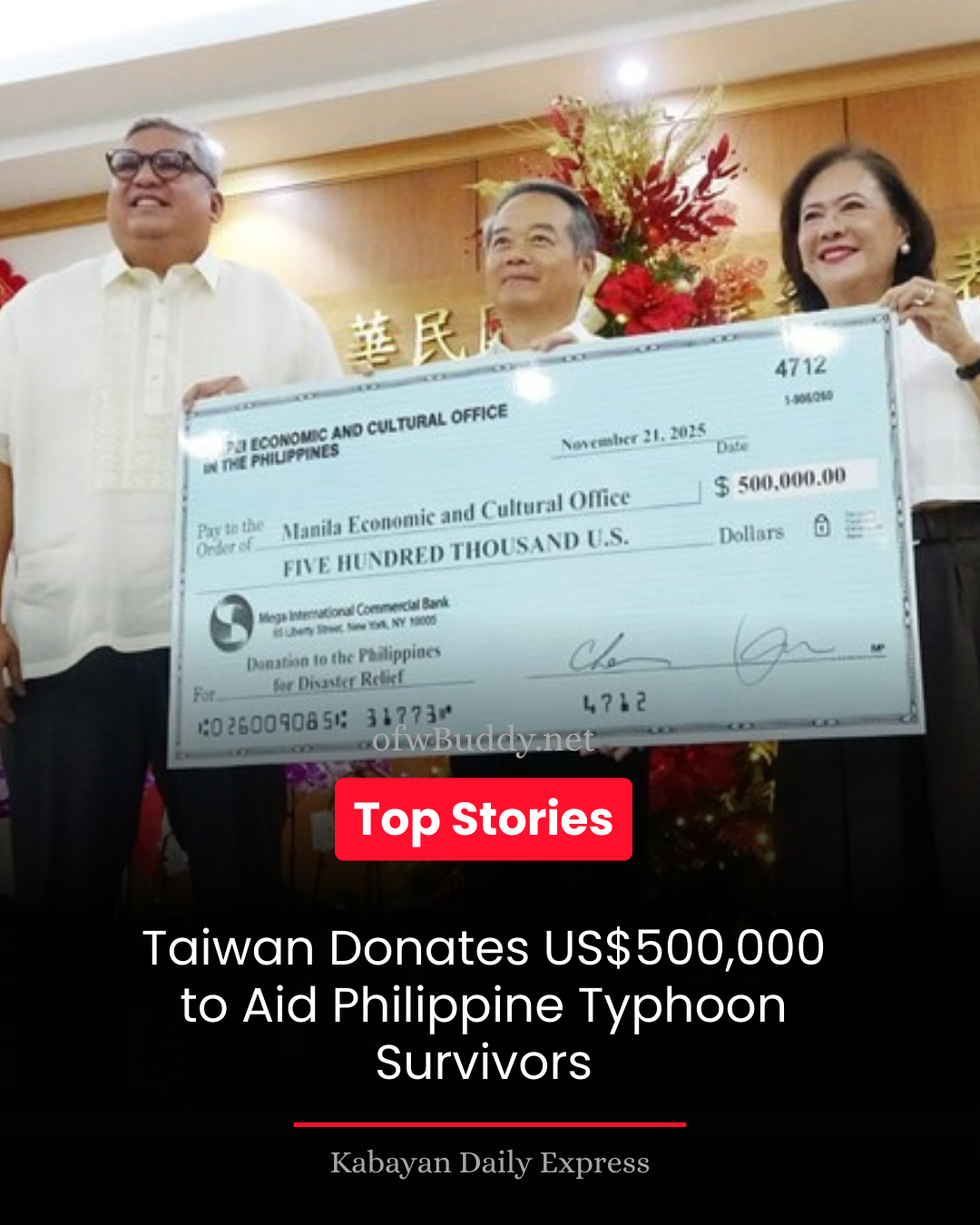 Manila, Philippines (November 21, 2025)— Taiwan has extended financial assistance to the Philippines by donating US$500,000 on Friday to help support ongoing relief and recovery operations following the devastation caused by two recent typhoons.