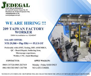 A new employment opportunity is now available for Filipino workers seeking to build careers abroad, as a Taiwan-based manufacturing company has officially opened its hiring for factory workers through a licensed Philippine recruitment agency.