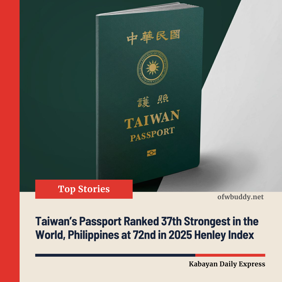 TAIPEI / MANILA (October 16, 2025)— The British consultancy firm Henley & Partners has ranked Taiwan’s passport as the 37th strongest in the world in the latest 2025 Henley Passport Index, granting its holders visa-free or visa-on-arrival access to 136 destinations.