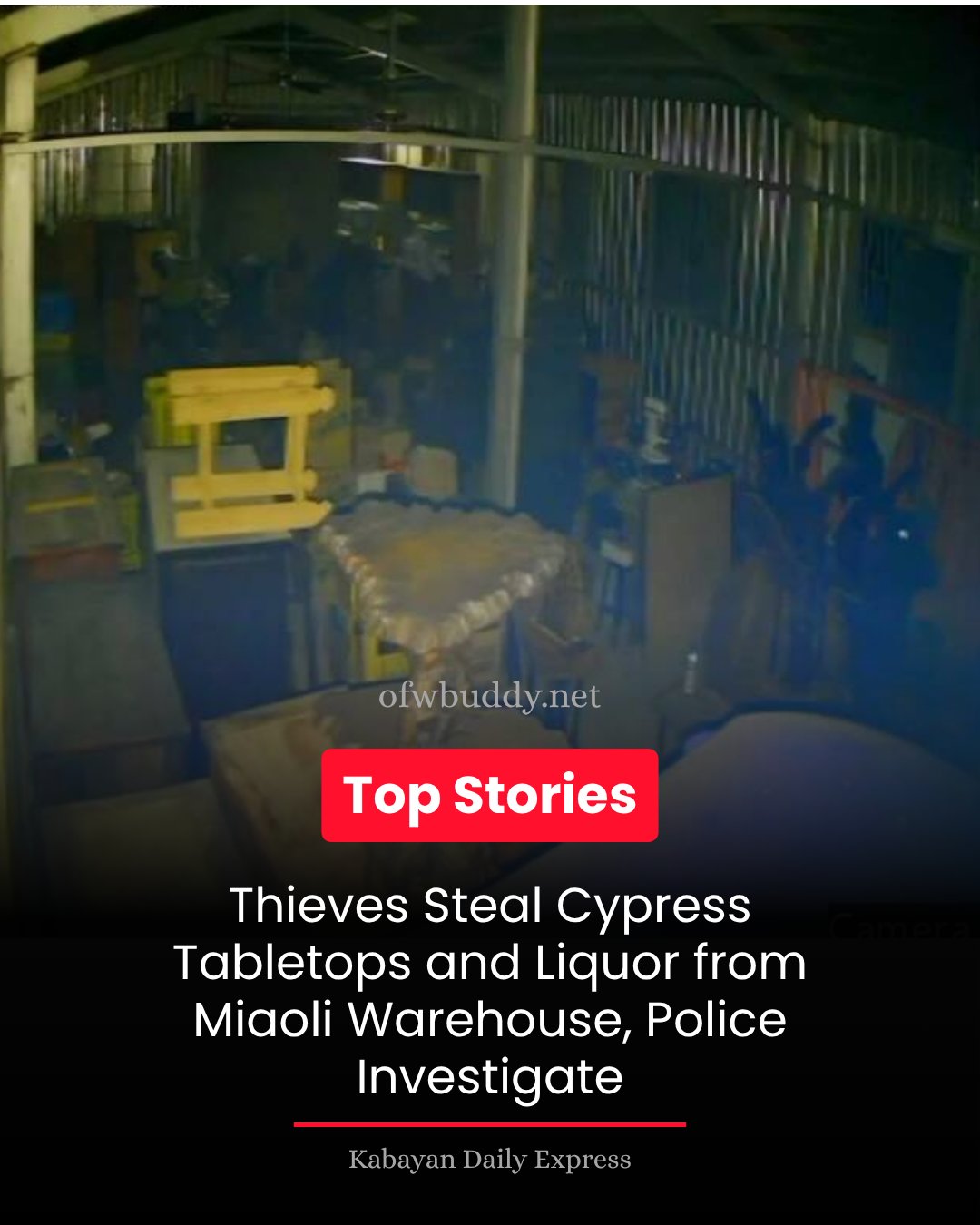 A burglary at a warehouse near a chicken farm on Xindong Street in Miaoli City, Miaoli County resulted in the theft of over 10 cypress tabletops and more than 10 bottles of valuable liquor, causing losses exceeding NT$1 million. The incident occurred at around 11 p.m. on October 22, and police are currently conducting a full investigation to locate the suspects.
