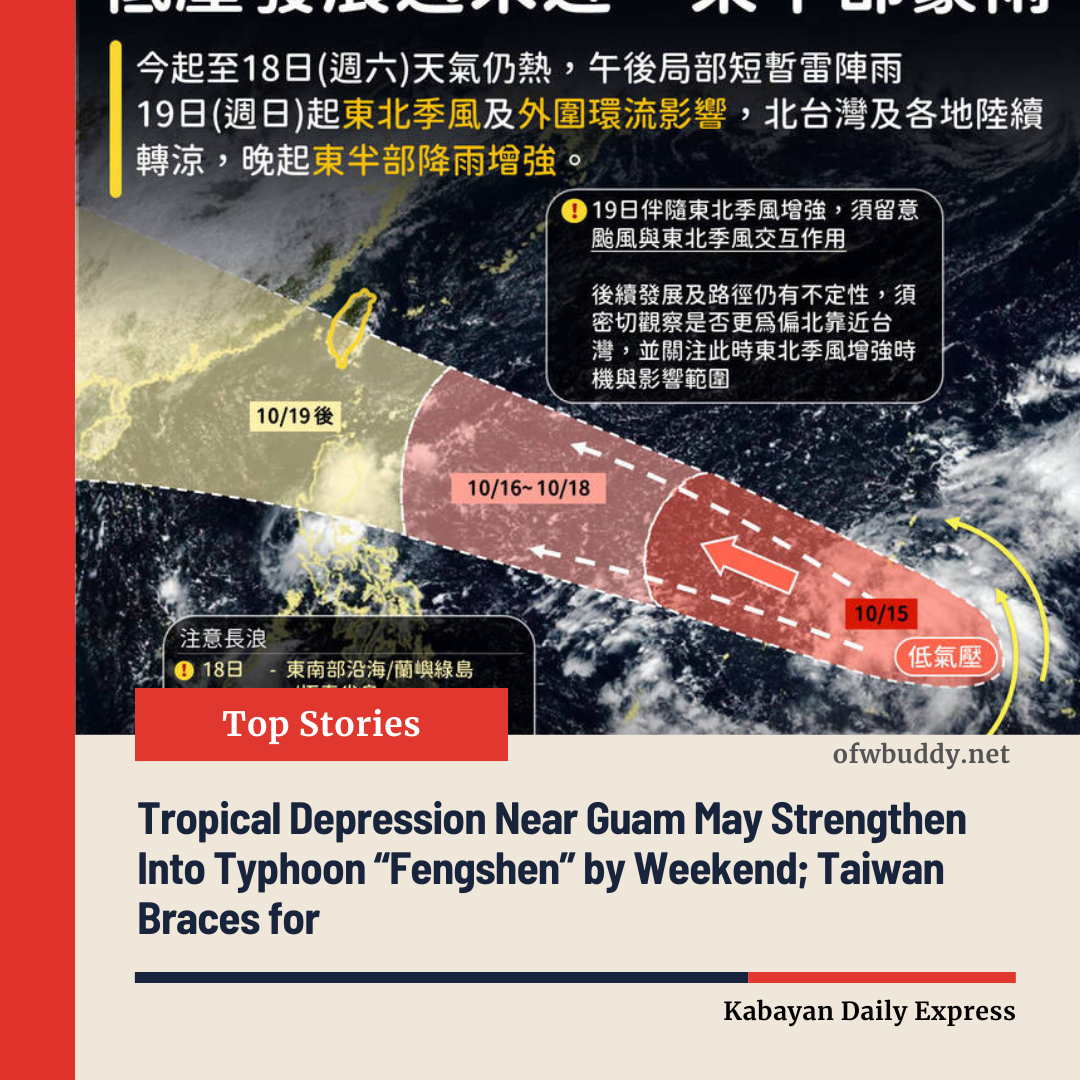 TAIPEI, Taiwan — October 14, 2025. A tropical depression is forecast to develop over the waters near Guam as early as Thursday, with the potential to strengthen into Typhoon Fengshen by Friday or Saturday, according to the Central Weather Agency (CWA). Forecasters are closely monitoring whether the system will interact with the incoming northeast monsoon, which could influence Taiwan’s weather in the coming days.