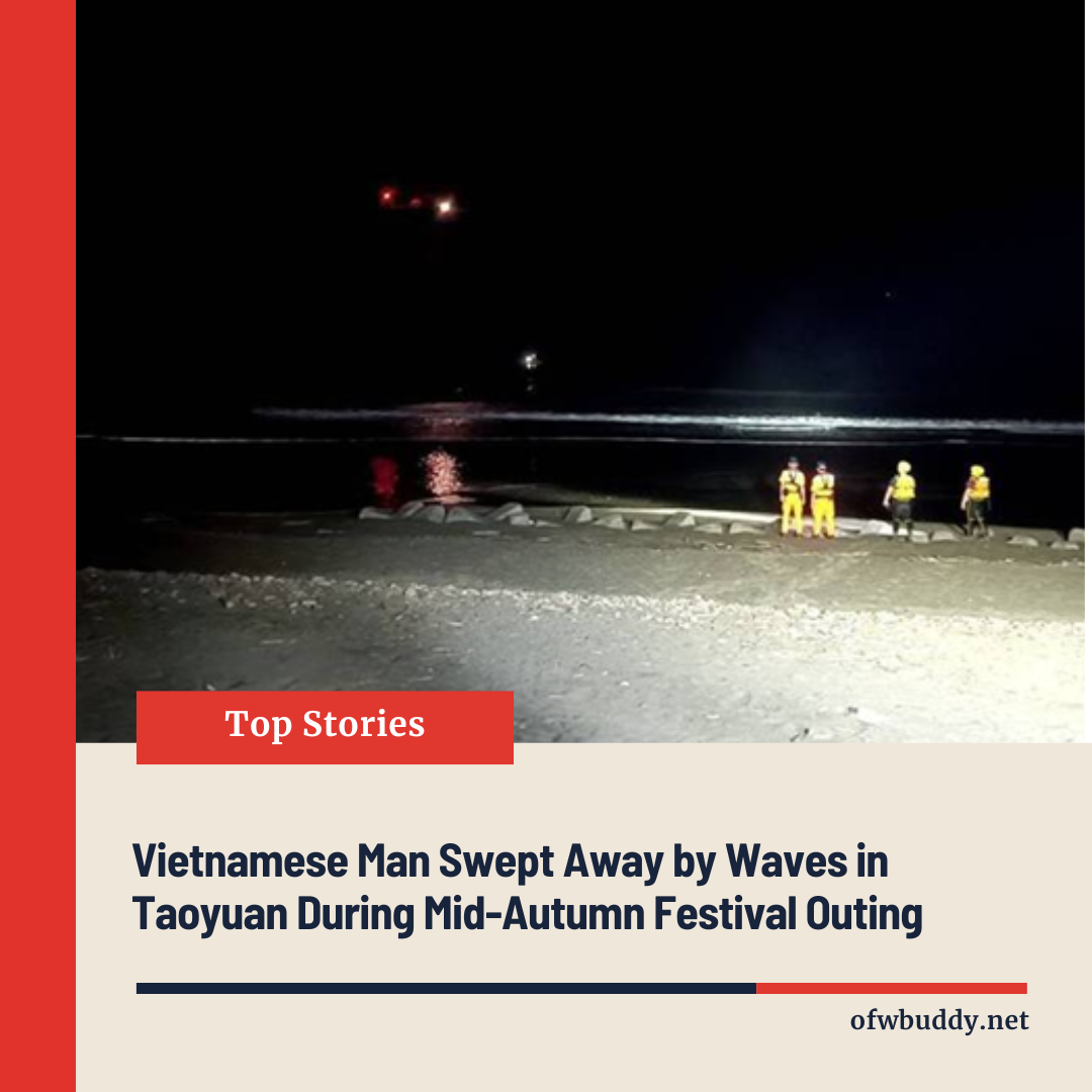 TAOYUAN, October 6, 2025 — A Mid-Autumn Festival outing turned tragic in Taoyuan City when a 32-year-old Vietnamese man surnamed Nguyen was swept away by powerful waves near Yongan Fishing Port in Xinwu District on Sunday evening. Despite an extensive search operation by rescue teams, the man remained missing as of last night.