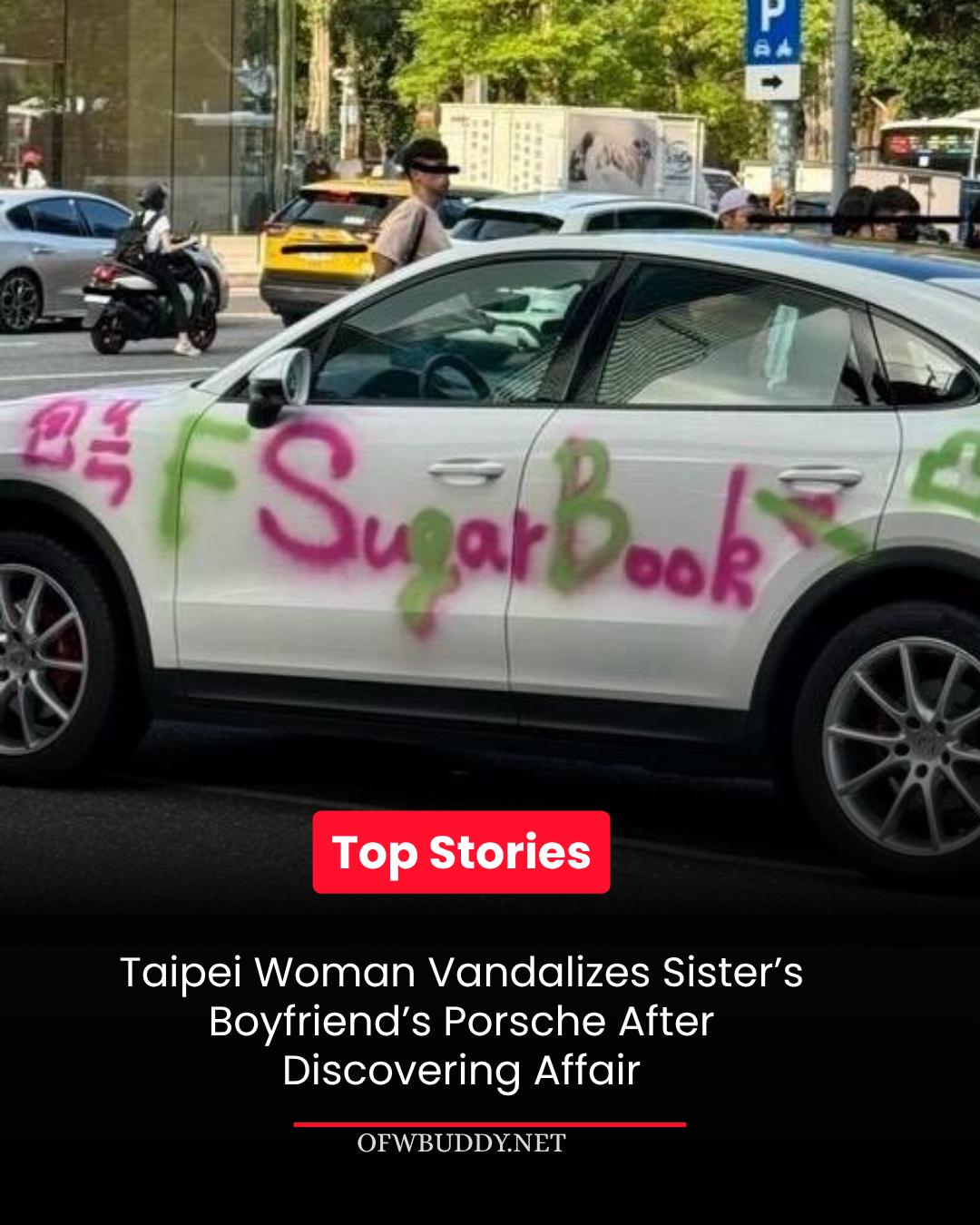 A woman in Taipei sparked an online frenzy after publicly vandalizing her sister’s boyfriend’s luxury car upon discovering his alleged infidelity. The act of revenge—captured and shared on Threads—showed a white Porsche Cayenne worth over a million New Taiwan dollars defaced with colorful spray paint and harsh messages.